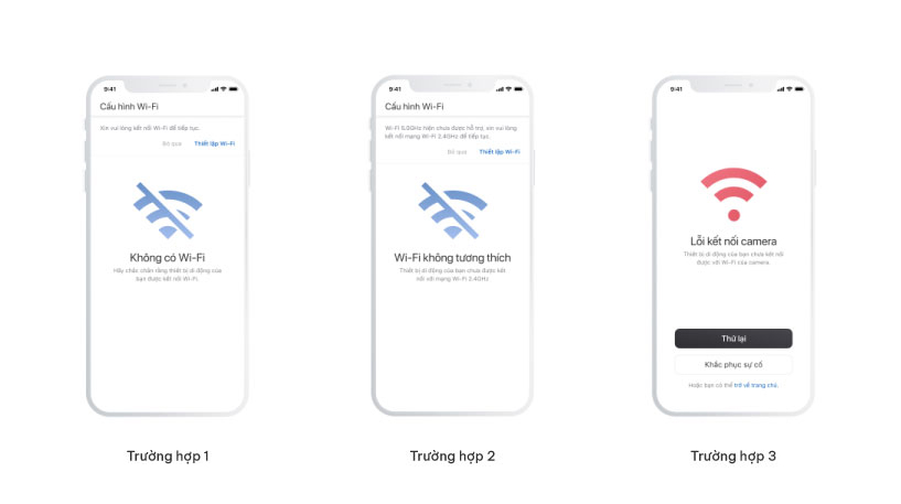 Trường hợp 3: “Lỗi kết nối camera - Thiết bị di động của bạn chưa kết nối được với Wi-Fi của camera.”