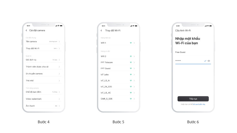 Bước 7: Nhập mật khẩu Wi-Fi, sau đó chọn “Tiếp tục” để tiến hành kết nối mạng Wi-Fi.