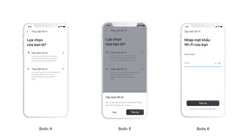Bước 6: Nhập mật khẩu Wi-Fi, sau đó chọn “Tiếp tục” để tiến hành kết nối mạng Wi-Fi.